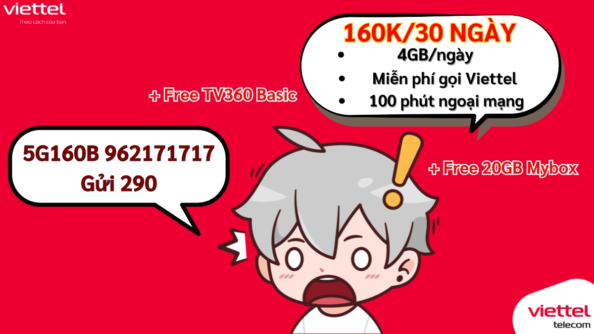 Đăng ký ngay: Soạn 5G160B 962171717 gửi 290 hoặc truy cập vietteltelecom.vn để kích hoạt gói cước và tận hưởng ưu đãi hấp dẫn!