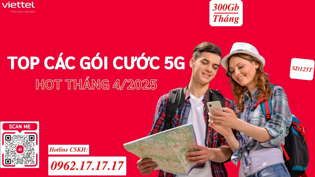 TOP các gói cước 5G Viettel hot tháng 4/2025 như SD125T, 5G135N, 5G150N, 5G180B, và 5GLQ190 mang đến lựa chọn đa dạng từ data đến combo data nghe gọi miễn phí, giá chỉ từ 125.000 VNĐ. Với tốc độ siêu nhanh, dung lượng lớn và ưu đãi TV360, Viettel giúp bạn tận hưởng Internet 5G đỉnh cao cho công việc, học tập và giải trí. Đăng ký ngay hôm nay để trải nghiệm mạng 5G hàng đầu Việt Nam!